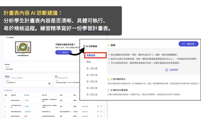 3. 以目標為導向的計劃內容診斷系統:分析學生每週計畫內容,即時提供個別建議,引導寫出具體可行的學習計畫,練習掌握執行要點:明確具體、可量化、可達成、有時限性。