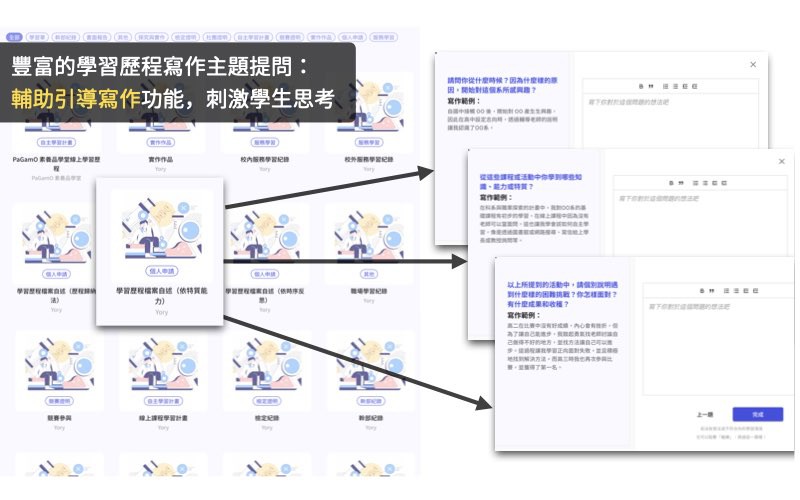 b. 針對不同寫作主題,由淺入深地設計各段落引導問題,刺激學生思考及回顧自我,逐步寫出屬於自己的學習故事。
