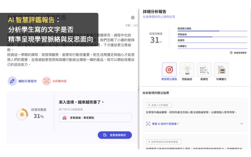 b. 系統分析學生文字內容,給予修正指標建議與進階優化報告,幫助學生隨寫隨測、越寫越好,降低老師重複指導工作的負擔。